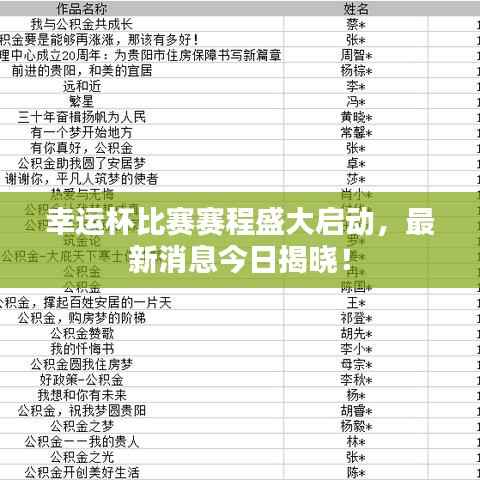 根据最新消息,幸运杯比赛赛程已经确定,比赛将正式拉开帷幕,各参赛队伍和选手将展开激烈角逐,以下是最新赛程安排: