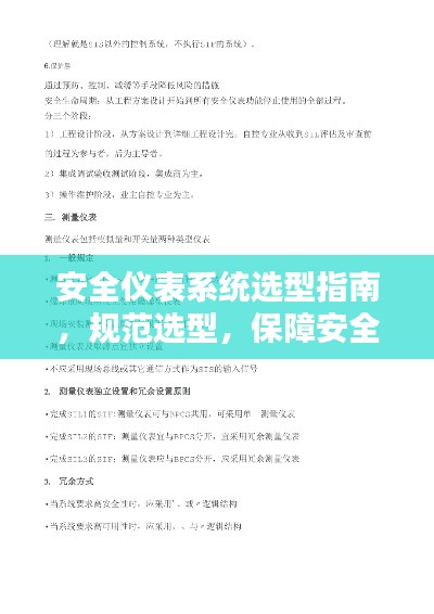 安全仪表系统选型规范对于保障工业生产安全具有重要意义,在选型过程中,应遵循适用性、可靠性、先进性和经济性等原则,充分考虑现场环境和工艺需求,选择合适的仪表系统,在使用过程中,应定期进行维护和保养,确保其性能稳定,为工业生产提供有力保障。