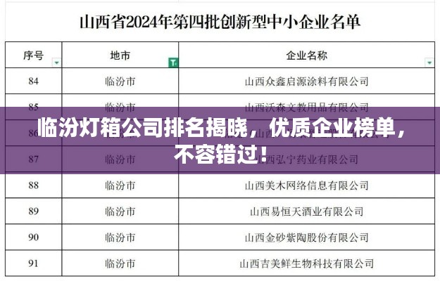随着广告行业的快速发展,灯箱作为重要的宣传媒介,其市场需求日益增加,临汾地区作为山西省的重要城市,拥有众多的灯箱制作公司,本文将介绍临汾灯箱公司的排名及相关信息。