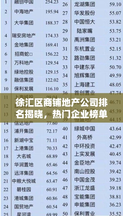 随着城市化进程的加速,商铺地产行业在徐汇区蓬勃发展,众多地产公司纷纷涌现,本文将为您介绍徐汇区的商铺地产公司排名,以帮助投资者和创业者更好地了解当地市场。