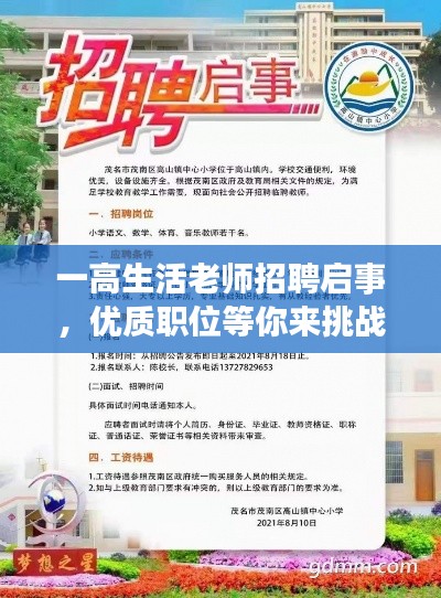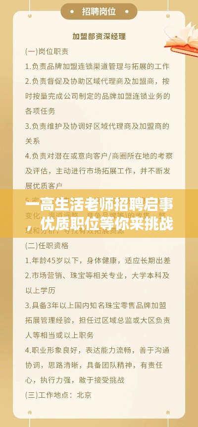 随着教育行业的不断发展,对于高素质的教师需求也日益增长,一高生活老师职位的招聘信息正式发布,为有志于从事教育事业的人才提供了良好的就业机会。