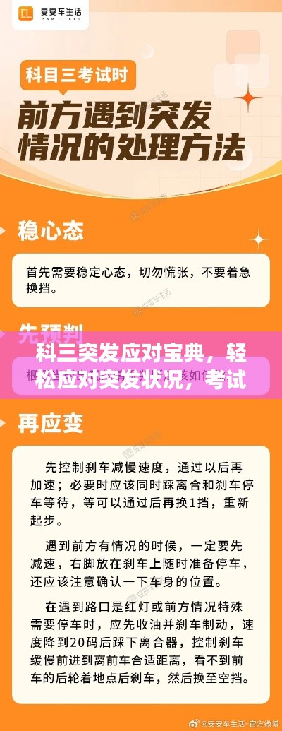 科目三作为驾驶考试中的重要环节,学员需面对各种突发情况,本文提供了针对科三突发情况的应对策略和注意事项,希望能为学员顺利通过驾驶考试提供帮助,在驾驶过程中,保持冷静、遵守交通规则、提前预防、不断练习是提高应对突发情况能力的关键,最后祝愿所有学员能够顺利通过科目三考试,成为一名合格的驾驶员。