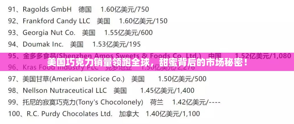 在全球范围内,巧克力作为一种受欢迎的甜食,一直受到人们的喜爱,而在众多巧克力消费国家中,美国的巧克力销量一直名列前茅,本文将对美国巧克力的销量进行介绍,并分析其背后的原因。