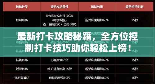 随着科技的发展,打卡已成为我们日常生活中的一部分,无论是工作、学习还是健身,打卡都扮演着重要的角色,本文将为大家分享一些关于控制打卡的攻略,帮助大家更有效地进行打卡,提高工作效率,确保学习进度,达成个人目标。