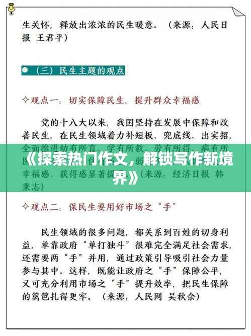 总之,要想写出热门作文,我们需要在选题、立意、结构、语言、细节等方面下功夫。通过不断学习、实践和总结,相信我们都能在写作道路上取得更好的成绩。让我们一起探索热门作文的奥秘,解锁写作新境界吧!